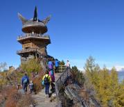 观鱼台位于喀纳斯湖西岸骆驼峰顶上,是俯瞰喀纳斯湖全景的最佳角度,也是为了观湖怪而建的。据说举目北望,能清楚地看到阿尔泰山的最高峰——友谊峰。哪儿是北?城里的孩纸找不到北,555~~~ 下了区间车,开始沿着石阶爬山,一路爬山、一路观景、一路拍照。 爬了1068个台阶,终于到达山顶观鱼台亭子。一边喘气,一边在亭子内往外看,找最佳角度继续拍照。 拾阶而上,映入眼帘的喀纳斯湖面逐渐扩大。 再上台阶,能看到远处的喀纳斯湖被积雪覆盖山顶的山遮挡住了。 观鱼台形象是根据喀纳斯湖怪的想象来建造的,木制结构。 拍了几张照后,赶紧沿着木制栈道下山。 走了几步,看着蓝天、远处的雪山,以及栈道两边开始泛黄的松树