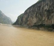 在白帝城是远观瞿塘峡的壮观雄伟。 此时倚在船栏上近看夔门才知它的险峻。两岸山峰陡峭如壁,如同刀削斧砍一般,山高狭窄拔地而起,把滔滔大江逼成一条细带,蜿蜒于山谷中。仰视碧空,云天一线,峡中水流喘急,奔腾呼啸,听到船头破浪发出巨大的欢腾声。