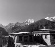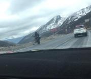 翻越海拔4300米白雪皑皑的折多山。老天眷顾,让我全面体验了折多山那变幻无常的气候!折多山西面还是阳春白雪,折多山东面却是雪花飞舞,这种强烈的气候反差与更迭,竟然就在山顶垭口上奇妙的转化着!突来的大雾和雪花、冰雹让我的行动变得艰难起来 ,湿滑是最大的危险!还好,幸运它一直相伴着我