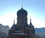 索菲亚教堂位于中央大街上。是哈尔滨美丽的风景旅游景点之一。教堂里的绘画是描绘了哈尔滨的发展历史。