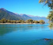 春天的尼洋河充满生机,缓缓的水流绕过高高的河床,岸边的树木刚刚发芽,初春的黄色、蓝色、还有一丝的绿色组成了一幅充满生命的画面,背后的青山藏在白云间若隐若现。现在还不是桃花大面积盛开的季节,等到春来报,河岸上姹紫嫣红造就了如诗如画的锦绣山河。相比于雅鲁藏布江的波澜壮阔,尼洋河是秀美的,宛若一位花季少女,从源头的雪山静静穿过原始森林,悄悄地滋润着工布江达这一片的大地。