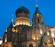 圣索非亚教堂始建于1907年,是远东最大的东正教教堂,平面呈拉丁十字布局,是典型的拜占庭风格建筑。教堂外部和索菲亚广场都是免费参观的,不过教堂入内需要门票,15元,圣·索非亚教堂内部叫做哈尔滨市建筑艺术馆。教堂的昼夜景色给人不同的感觉,夜景美丽得震撼。教堂顶部穹顶到地面的距离非常高,即使用全景扫描也无法照全,很壮观!教堂外部有很多鸽子,这也是特色,可以花钱买鸽粮喂。