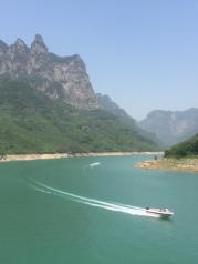 来到河南焦作怎能不到云台山游一游呢!做了好久的车来到云台山景区,六月的云台山也是酷热了,游客必备伞和凉帽,山下礼品店也是有卖的。景区里是有上山的环线大巴的,有空调,盘山路景色,周边峰洛有序、云雾缭绕。中午吃饭可在景区内,有特色饭店,菜品还可以,价格也OK,总体感觉河南物价不高。我们一行人还体验了云台山主推的动感飞艇,80元一人,比较刺激、时间大约10分钟!需要走很多路,游客们要有心理准备哦!