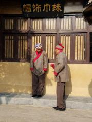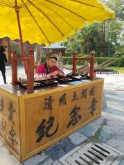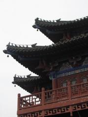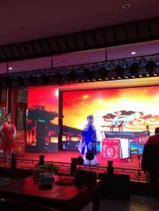 到了开封一定要去天波杨府看看的啊。很不巧的是天下雨,气温有点低。赶到杨府门口,“杨家将”热闹的迎宾仪式刚刚收尾,而因为下雨,之后的一场表演也取消了。好在杨府里回廊四通八达,我们也可既避雨又观景了。建筑塑像都是新建的,少了点历史感。不过在杨府展出的今年开封新培育的七彩菊和豫剧博物馆的演出,给了我们意外的惊喜。杨府里的开封豫剧博物馆有豫剧折子戏的演出,只要不坐前面摆有茶水瓜子的方桌,后面的座位都是免费的,不少本地的剧迷天天来看,有的已可全场跟唱了。据当地人讲,这些演员都是本地的名角哦