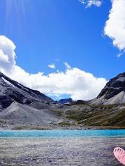 五色海木底措景区位于牛奶海上方100米,距离300米左右,海拔4700米,湖面呈圆形。由于海拔高,这300米路程虽然不长,但走起来很辛苦。走几步就会喘不上气来。