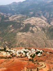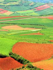 东川红土地方圆数百公里都是红土,往往一部分的红土地翻耕待种,另一部分已经种上绿绿的青稞或小麦,远远看过去,就像上天涂抹的色块。东川红土地,最美最集中也是最富有变化的地方,在出东川40余公里的一个叫花石头的村子周围,村子周围的地里一年四季长着不同的农作物,收的收,犁的犁,种的种,使红土地上的景色“活”了起来。春天,银白的地膜与红土地交相辉映,红白相间不久,就迎来了油菜花儿黄、小麦苗儿绿,一片白,一片黄,一片绿,白黄绿中又有红色,色彩斑斓;