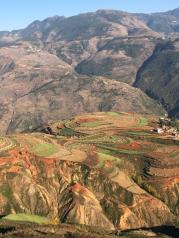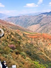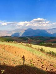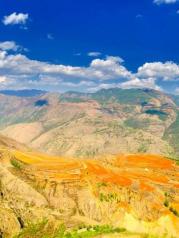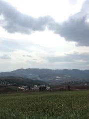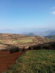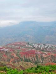 红土地没想象中好,进入眼帘的是红绿黄交错的大小梯田。但是遗憾的是,上到红土地之后,蓝天就收了起来,一路都是灰蒙蒙的一片。加上云层较厚,远处的风景也被雾气朦朦胧胧的遮着。