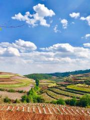 红土地,景点真的很美,除红土地本身景点外,一棵千年老龙树很不错,特别适合情侣或夫妻在此合照。东川红土地给人感觉真正是太震撼了,一块块土地错落在眼前,每个土地都有不同的颜色,名副其实的天然调色板。