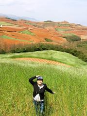 东川红土地——很不错的一个景点,还是半开发的状态,相当的漂亮。一开始我和闺蜜研究的是怎么去车站坐车,后来无意中看见一个游记推荐的昆明包车拼车师傅,花了258个大洋拼着过去的。事实证明我们的选择是正确的,服务相当的好,午餐也含了,最重要的是节约了很多时间。照片手机拍的,完全没体现出红土地的壮观来,我们去的时候正是小麦成熟的季节,有风的时候很有风吹麦浪的感觉。师傅的卫星7 894 8125,真的很赞,不过就是路程太远了,山路十八弯啊,闺蜜平时不晕车的都绕晕了!