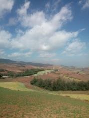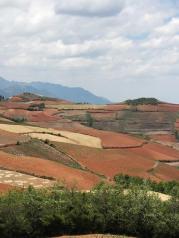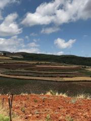 东川红土地这个地方交通非常不方便,从昆明市区出发要倒三次车才能到。据说该景点正在开发中,现在还不要门票。鉴于这样一个情况,我们只能请老司机带路了。选择了携程包车,720元。司机赵师傅怕路上堵车,很早就到酒店来接我们了。一路开到东川2个半小时,这路况真的能把早饭颠出来。老司机介绍说这个景点已被承包下来,现在正在修路造酒店规划景区大门,之后就要收门票。透过车窗外翻腾的土灰,一路上到处都在施工,心中不知是喜是忧。喜的是旅游方便了,忧的是又一块处女地被开发了。慢慢的一大片一大片的红色土地印入眼帘,我们的目的地到了。没有具体的景点,全凭老司机带路。赵师傅人很热情,只要路上你觉得好看的,都可以下车游玩拍照