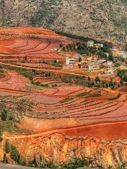 东川红土地位于昆明市以北偏东方向,属昆明市东川区的红土地镇。从昆明驾车到达景点约250公里车程,主要景点在海拔1800-2600米之间。这里高温多雨,土壤含铁成分较多,铁质经过氧化慢慢沉积下来,逐渐形成了醒目的红色色彩。景区设有栈道和观景台,从此处观看,未种农作物的土地呈红色,已经种上的农作物呈绿色,远看就像涂抹颜色的红绿相间色块,衬以蓝天白云和白色房子的村庄,构成红土地壮观的景色。