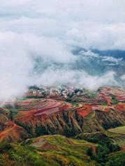 东川红土地】如跳动的五线谱,如遗落的调色板,层层叠叠、错落有致。天光云影轻轻抚摸着红色的土地、绿色的青稞,散落在田间的村落如世外桃源般美丽。