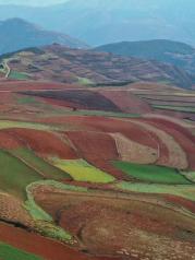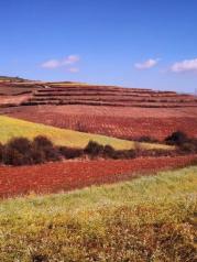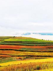 东川红土地,地处云贵高原北部边缘,素有“铁胆石之乡”和“天南铜都”的美誉。因土壤含铁、铝成分较多,有机质少,酸性强,土质黏重。在当地长期高温多雨的冲刷下,土壤里的铁质经过氧化慢慢沉积下来,逐渐形成了炫目的色彩。站在山腰处,山风强劲,衣裙飞舞,仿似一众仙女下凡。