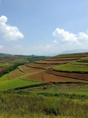 东川红土地给人感觉真正是太震撼了,一块块土地错落在眼前,每个土地都有不同的颜色,名副其实的天然调色板。东川红土地非常大,没有大门,不收门票,也没有区间车之类,点和点之间的距离比较远,大大小小的观景台有几十个,没有车很不方便。