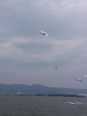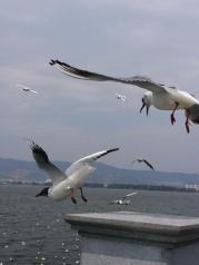 滇池上洁白的海鸥在水面轻盈掠过,一艘艘渔船在浪里穿行。这不是湖,却胜似湖,这不是海,却与海的感觉相仿。听人说这里确实有一个名字叫做滇海。负手走在湖边的小路上,细雨打湿了乱发,却不能惊扰喜庆的心。