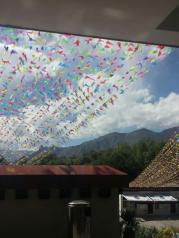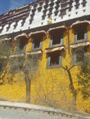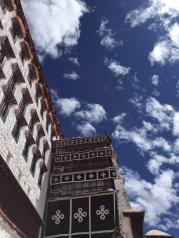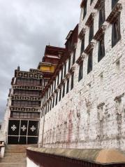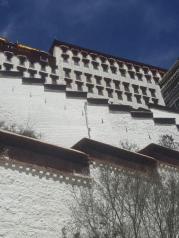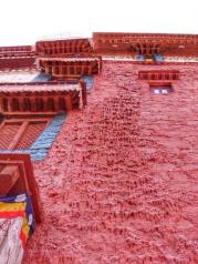 去布达拉宫的时候,一大早就过去排队,还只是淡季,太阳刚升起的时候队伍就已经从门口排到了大马路上,队伍里睡眼朦胧的游客,也有手持佛珠的藏民们。广场上的白鸽在布宫顶上盘旋飞过,阳光从东面一点点位移,最后把整座布宫都照亮。 最中间的红色建筑是红宫,主要为佛殿及历代达赖喇嘛灵塔殿,包围着它的则是一群白色建筑,为达赖喇嘛居住的部分。统一花岗石的墙身,据说这墙身有牛奶的成分。红宫内部比较昏暗,印象最深的是一座五世达赖灵塔殿,足有5层楼高,塔身以黄金包裹,达11.9万两之多黄金,也就是3721公斤黄金!非常华丽,并且镶嵌着许多珠玉玛瑙。塔身里放置着五世达赖喇嘛肉身。 藏民们转红宫的时候也都会一路诵着经文,在