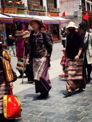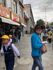 八廓街是所有到了拉萨的游客必去逛逛的地方。但是我们在八廓街附近很难找到停车位,只好将车停到了一个较远的地方,再穿过居民巷子往八廓街方向走。但有幸的是,我们一路走在小巷中,两边都是很有特色的地方民居,以两三层的小楼居多,带小院的平房也有。虽然外墙看上去都翻新过,但藏红色的门窗与金色的屋顶修饰得很漂亮,还不时有来来往往的当地居民与我们擦身而过,穿行之中就像到了一座古朴的藏族小村落!不少上了年纪的藏族老人们就坐在屋檐下喝着甜茶聊天。虽然听不懂他们说什么,但看着这副悠然自得的生活还是让人好生羡慕!其实见着我们路过,他们也会好奇地打量一番,让我们感觉是不是遇上了拉萨的“朝阳群众”!而一路上还不时有各种特