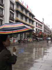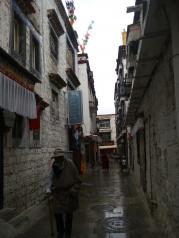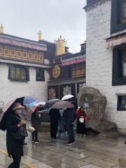 到了拉萨,有几处地方是非要去的,八廓街就是之一。八廓街是不能开车进入的,可它延伸的范围很大,不一定非得停到主街附近再步行,况且主街上反正也是逛店铺,没有太多人文可看。因此我们就找了个停车方便的地方,通过一条条蜿蜒曲折的小巷往里走。虽然绕了些远路又在下着些小雨,但让我们见识到了小巷中很有地方特色的民居!这些房子最高就两三层,从外墙看去像是新的,但也能看到的确住着人,应该只是翻新过,并非特意为了旅游而建的空房!同时,我们还接触到了来来往往的当地居民!一路上的各种特色小店或日用品铺子也多,都是年轻的藏人在经营着。她(他)们将大包小包的商品不时背进背出, 看着都挺忙碌的,可似乎干劲很足;上了年纪的那些