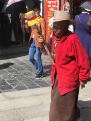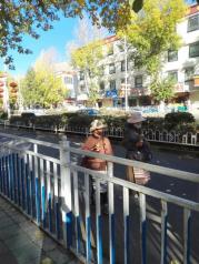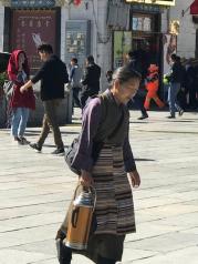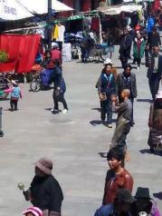 大昭寺外面是拉萨的老城区----八廓街。八廓街引又名八角街,是拉萨著名的转经道和商业中心,较完整地保存了古城的传统面貌和居住方式。八廓街原街道只是单一围绕大昭寺的转经道,藏族人称为“圣路”。现逐渐扩展为围绕大昭寺周围的大片旧式老街区。 八廓街是传统和现代文化融合的小镇,你可以看到藏族服饰,也可以看到现代潮流。 我国八十年代起执行严格的计划生育政策,一对夫妇只允许生育一胎。但对西藏等少数民族却不受限制,所以可以看到许多藏族妇女拖家带口,带着几个小孩。 老年人根深蒂固,还保持传统文化。