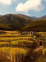 国庆假期后去的的连山欧家梯田,车直接开上山欧家村停车场。节假日要停山下小学再花20元乘农家的车子上山的。山道畸岖。正在修道建房中。农家乐住一晚食农家菜。不错的地方。金色的垄上行。日落日出都挺美哟。收割前或收割后的梯田各具特色。