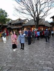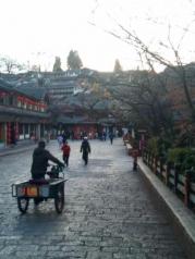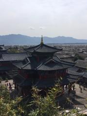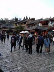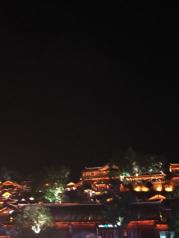 四方街空间相对开阔,是游人的集散地,也是集中表现当地纳西族特色的活动场所。经常有纳西族中老年妇女身着民族服装在此围圈跳舞。看着她们慈祥、欢快的无忧无虑的笑脸,真让我羡慕和感动不已。黄昏时,我沿着狭窄的街巷不知不觉走到了古城的山坡上,站在一间休闲食店的二层天台上,俯视古城全景,只见密密麻麻的房顶连成一大片,十分壮观!