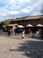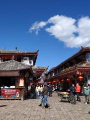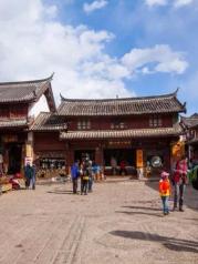 四方街位于丽江古城中心,交通四通八达,街巷相连,周围小巷曲径通幽,据说是明代木氏土司按其印玺形状而建,有权镇四方之意。四方街是一个小广场,占地约六亩,以清石铺地,四周有六条小街依山势而建,辐射开去,交通极为便利。周围建筑至今依然大片保持明清建筑特色,现在作为店家商铺使用。这里是游客必来之处,很多人在这里歇足休息。
