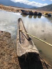 走到湖边开始觉察泸沽湖的美了,离湖水很近的地方觉得湖水还是很蓝的,岸边停泊着许多的著名的猪槽船,淡黄色的木色和蓝蓝的湖水及其相配,都是最原始的颜色,风很大,慢慢地阳光开始变好了,爬到野山坡上,一般的经验总归是站得越高风景越好