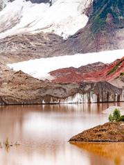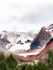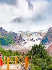米堆冰川位于西藏东南林芝市波密县玉普乡的米堆村,景区大门就在国道318的旁边,购票后坐景区车几公里就到了。这里是念青唐古拉山与伯舒拉岭的接合部,米堆冰川雪线较低,雪线的末端只有3700多米,而冰瀑长,非常的壮观。因为雪线低,雪线以下不远处就有茂密的森林和冰湖,同时由于山体的岩石以红色为主,这就形成了多彩的色彩,白雪皑皑,彩云朵朵,森林绿郁葱葱,山峰火红,这一切倒映在冰湖中,形成五彩斑斓的米堆冰川。