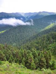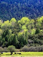 鲁朗林海位于林芝地区八一镇以东约80km的川藏公路上,海拔3700m,这是一片典型的高原山地草甸狭长地带,林海由两侧青山中的灌木丛和茂密的云杉、松树组成,树木以青冈为主,林海中间则是整齐划一的草甸,溪流蜿蜒其中,此外还有大量鸟类栖息于此。每年4月中旬到6月初,成千上万种野花竞相开放,山间云雾时聚时散,雪山、林海、田园勾画了一幅恬静、优美的“山居图”。