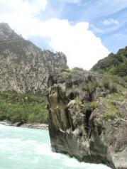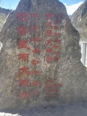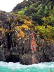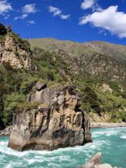 尼洋河中流砥柱位于川藏路上318国道林芝地区尼洋河中游,这里山高沟深,河流湍急,为尼洋河第一大峡谷,河中间突起一块巨石,上面题着红字“中流砥柱”,相传这是工布江达地区守护神工尊德姆修炼时的座椅