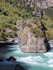 尼洋河中流砥柱是尼洋河有一处景观,那块岩石像一牧带纽的四方印章,有一幢别墅大小,矗立在尼洋河激流中心。河水冲击到这块巨石上,溅起一片浪花,翻滚激荡,夺路而去。游客们都在这里下车观看,惊叹,拍照。对于水中这块巨石,游客们的议论和感慨有两种观点。一些人说,这才是真正的中流砥柱,惊涛骇浪,岿然不动。