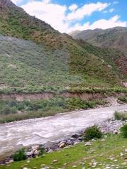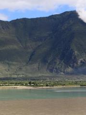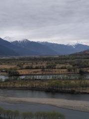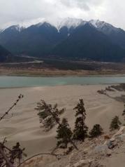 尼洋河发源于工布江达,在苯日神山附近汇入雅鲁藏布江,图片中尼洋河从左侧的山谷中流出,雅鲁藏布江从右边的山谷留来。尼洋河水清澈碧绿,雅鲁藏布江水十分浑浊,两江汇合处类似内地的“泾渭分明”。在工布江达县境内,尼洋河一直沿着川藏线流动,水十分清澈透明,很是养眼。