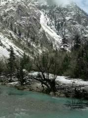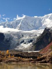 到米堆冰川时,看到了米堆冰川一角,被诱惑,买了门票就往里走,7公里,全土路,比较难走。到达停车场后,步行上山,这是第一次近距离看冰川,心里还是很激动的,加上冰川前小山丘上的树叶的黄绿相间的色彩,让冰川看起来格外漂亮。
