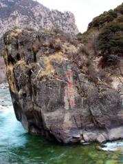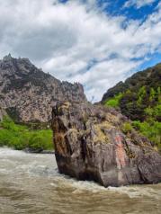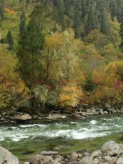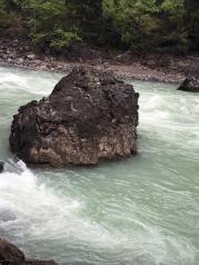 从米拉山口下山前行,来到了尼洋河中流砥柱景点,许多人纷纷拍照留念。尼洋河中,水流很急,浪花朵朵,水声震耳,中流砥柱巨石傲然矗立在河水中央。据说巨石被当地人贡为“守护神”,每逢黄道吉日时就会烧香朝拜。