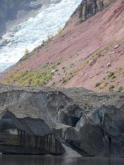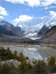 到米堆冰川时,看到了米堆冰川一角,被诱惑,买了门票就往里走,7公里,全土路,比较难走。到达停车场后,步行上山,这是第一次近距离看冰川,心里还是很激动的,加上冰川前小山丘上的树叶的黄绿相间的色彩,让冰川看起来格外漂亮