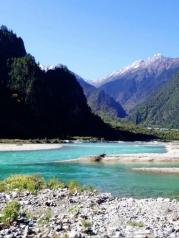 尼洋河中流砥柱像一个柱子一样阻挡住河水,这里河水非常漂亮,尤其是水清的时候,宛若一枚玉钮。