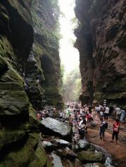 龙潭大峡谷这是一条由紫红色石英砂岩经流水冲刷下切形成的U型峡谷,这里瀑飞潭幽,谷深峡窄,石奇荫绿。走在这崖红荫绿的峡谷里,微风吹过,似乎能够真切地听到海浪那欢快的歌声。谷内嶂谷、隘谷呈串珠状分布,峡秀谷幽,潭瀑联珠,壁立万仞,海滩沉积岩所形成的波纹石、波纹岩等古海遗迹随处可见。