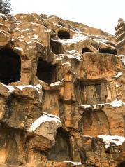 我们到龙门石窟这里是年前,所以人不多,而且刚下过一场大雪,正常这里是把车停在景区外,然后坐统一的观光大巴进入景区的,因为雪天场内大巴怕有危险发生,所以工作人员让我们把车直接开进了景区,不过中途因为路状不熟还是小绕了一圈。很多年前我就来过龙门石窟,这次是带小朋友来感受一下。那时还是很天然的,没有那么多的护栏,而且有的石洞里是可以进去参观的,估计是现在来的人太多了,加上有些个别人的不文明行为,所以几乎所有洞口都加上了围栏。门石窟开凿于北魏孝文帝年间,之后历经东魏、西魏、北齐、隋、唐、五代、宋等朝代连续大规模营造达400余年之久,南北长达1公里,今存有窟龛2345个,造像10万余尊,碑刻题记2800