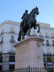 从Sol的地铁站出来就直接是太阳门主广场了,这一片就是这个城市的老城区中心。人潮涌动,川流不息,周边的各种美食的百年老店也很多。 喷水池旁矗立着卡洛斯三世的骑马铜像。 当然,广场上一眼也能看到著名的熊和树莓雕塑,是马德里的市徽标志。