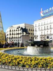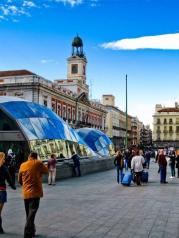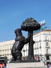 太阳门广场这里曾是马德里的历史中心点,里面的熊与草莓树雕像是以西元1222年市徽的图形而建造的。零公里标志碑代表了这里是西班牙交通枢纽的起点。周末时有艺人表演,此时的太阳门广场可以说是行人如织,热闹非凡。
