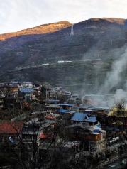 西索民居的清晨,是那样的默默静好。当第一缕阳光照射在村寨对面的山头上,村子里早已炊烟袅袅,金色屋顶的寺庙里传出阵阵念经声。我登上了村寨一头的半山坡上,记录下西索村藏寨美丽的一刻。