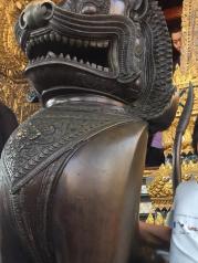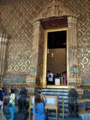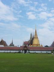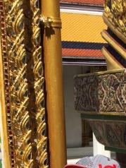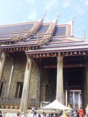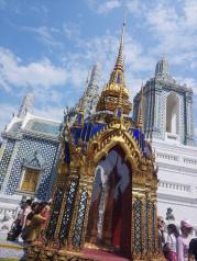 玉佛寺游客非常多,非常壮观的!整个的感觉就是金碧辉煌!里面的建筑也是各具特色!格鲁达小人表情各异,甚是可爱!蓝天白云的映衬下就更美了!玉佛寺就在大皇宫的里面,买了大皇宫的门票就可以去玉佛寺参观了,玉佛寺里最珍贵的宝贝当然是玉佛,玉佛寺的玉佛殿面积不大,一分钟都不要就走完了。