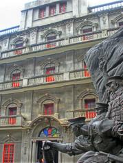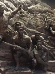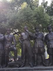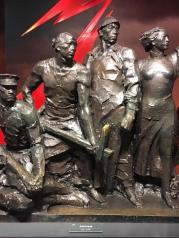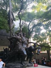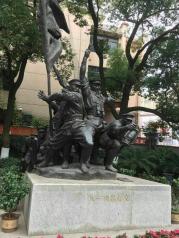 八一起义纪念馆需排队进馆,大概排了十五分钟左右。 纪念馆是免费的,凭身份证领票即可进馆参观。进入馆区,首先引入眼帘的是铜雕,它的右侧的灰色建筑是旧馆,南昌起义总指挥部旧址,铜雕正后方为陈列大楼。