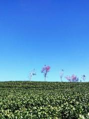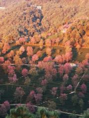 在樱花谷一号观景台观赏冬樱花,美就一个字。再沿步道用20分钟走到二号景区,就是在一号观景台看到的那面茶树坡,抵近观赏樱花。可以在无量山樱花谷入口附近,二号景区附近,或公路边的客栈住宿。