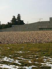 南京大屠杀纪念馆坐落在当年日军大屠杀地之一江东门万人坑上, 遗址刻着1937.12.13-1938.1一行黑色大字, 标明了日军南京大屠杀的时间。 建筑物采用灰白色大理石垒砌而成, 共分为外景展区、遗骨陈列、史料陈列三个部分。 外景展区由群雕、碑石、枯树、断垣残壁、 遇难者名单墙、绿树草坪等, 构成了生与死、悲与愤的纪念性墓地风格。