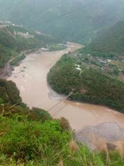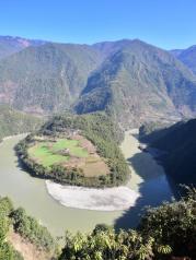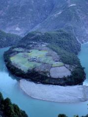 怒江大峡谷,怒江流经丙中洛日丹村,由于王箐大悬岩绝壁的阻隔,江水流向从由北向南改为由东向西,但流出300公尺后,又被丹拉大山陡坡挡住了去路,只好再次调头,因而在这里形成 “U” 形欧米茄大湾,称为“怒江第一湾”。在公路上观景台虽然用20mm左右的广角镜头就可以拍下怒江第一湾全景,但不是最佳的观景和拍照地点,这里不过显不出气势。