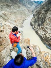 怒江大峡谷,为世界第二大峡谷,海拔在4000千米以上,峡谷寸草不生,黄褐色的峭壁隐隐透着迷人的光泽,黄褐色的江水极有厚重感,汹涌奔腾于谷中。小伙伴为了抓拍美景,不顾危险走上的吊桥。桥下几十米悬空,到底就是滚滚江水了