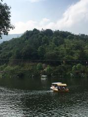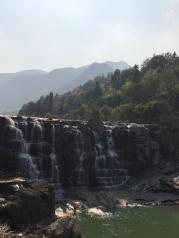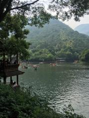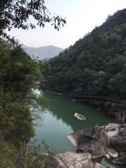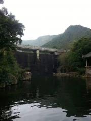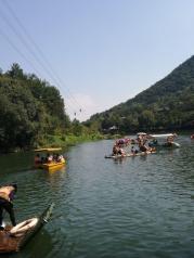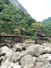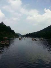 三月去九龙谷国家森林公园游玩,其中九龙谷霞客漂流,就在九龙谷景区内,沿着溪谷走到快到景区的尽头,左岸有一处堆着许多橡皮船的小木屋,就是漂流起点了。最好是雨水较多的时候去,既可以感受漂流的刺激,又可以领略沿途的风景。我8月底去的时候,溪谷里没多少水,溪谷中砌筑了一条固定走向的漂流滑道,漂流点的上游(景区的尽头)有一处瀑布,瀑布流下来的水汇集成一处水潭(湖),有一道水堤将水拦住,漂流要等到下午2点多,才放水,漂流船顺着这条滑道冲下来。