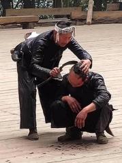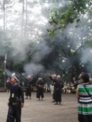 岜沙苗寨,中国最后一个枪手部落。很幸运老师能够带领我们一起走进这样一个原生态的少数民族,去体验他们的民俗风情。岜沙苗寨人还保持着自己原有的文化习俗,岜沙男子手持枪,腰佩镰刀,脚穿草鞋,有的腰间还配有葫芦,他们认为葫芦能够给人带来吉祥、幸运。岜沙苗寨的妇女大多数还不会说汉语,我们到了那里看完节目准备往回走的时候,正看见他们在吃午饭,而他们和我们不一样,他们是直接用手抓着吃,不用筷子。其实,岜沙苗寨给我最深的印象或者说最大的感慨就是:我很后悔自己出门的时候没有带一点什么能够帮助他们的东西,也很遗憾没有帮助他们什么,虽然那里作为一个正被开发的旅游景区,但是我不得不说他们那里生活条件确实不够好,住的房
