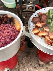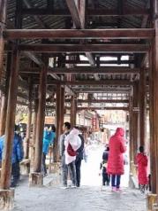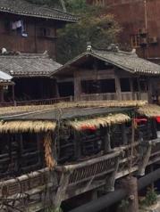 并无多大颠簸的到达西江千户苗寨,这个据说已有点商业化但又有点原生态的最大的苗寨吸引了很多人前往。今天也迎来了我们这一群十人的队伍,因是春节期间还是游人算少的。车在2小时后在西江停车场停下,然后就是背包进入。先是看见一张进寨的地图,找好自己的位置和将要去进餐的地方,如此可寄放下包后再游逛。只因是春节期间营业的饭馆很少,只在依山而建的旺旺农家乐找到了能吃饭的地方。穿过进村的一座木桥才算进寨了,只见整个寨子有一条溪流贯穿着,沿着溪水两边自有一些木建筑,也许是新建的,看上去比较新。玉米穗子沉甸甸的垂挂在屋檐上很有一种喜悦的味道,表示了收获后的成果。穿过村中的一座风雨桥,沿着老街找到上山的路,以往在电视